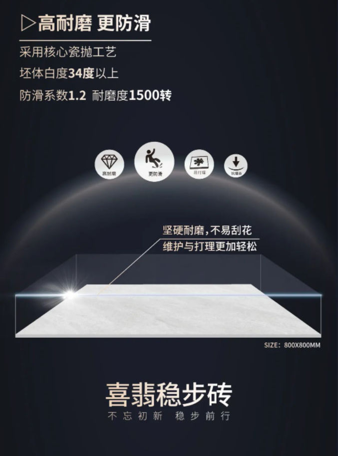 乐动·体育瓷砖2023年春季新品—喜翡稳步砖,采用核心瓷抛工艺,耐磨防滑技术再突破,亲肤防滑设计轻松应对各种空间需求,美观又安全!