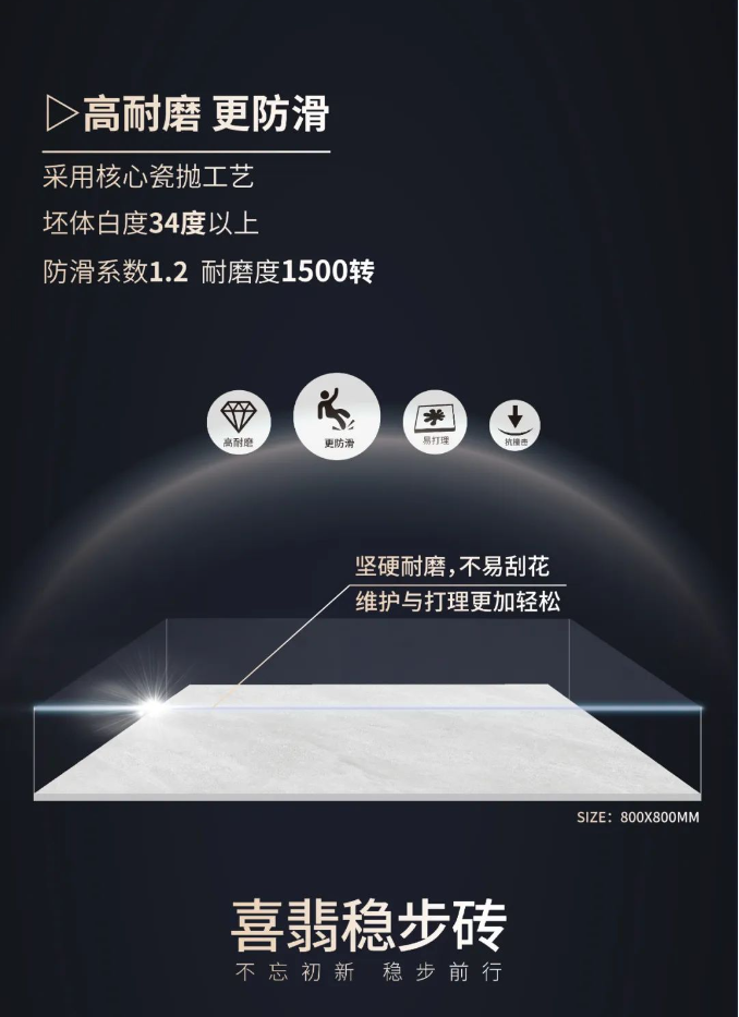 2023春季新品喜翡稳步砖,采用核心瓷抛工艺技术,精准平衡防滑与耐磨性能,实现高耐磨+高防滑效果,安全性更高。